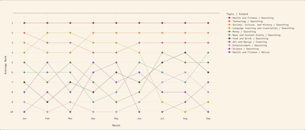 August data revealed a clear cyclical pattern between programming and gaming topics. Programming conversations climbed from Monday through Friday, while gaming queries surged on weekends. Users were equally likely to engage with both topics, but strictly segregated by day of the week.