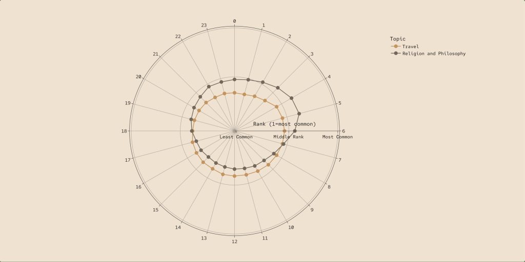 According to the report authored by Bea Costa-Gomes and Seth Spielman, religion and philosophy conversations rise through the rankings during early morning hours. Travel-related discussions, by contrast, peak during typical commuting times, suggesting users plan trips while in transit. “The larger-than-life questions seem to have a rise during the early hours of the morning, with ‘Religion and Philosophy’ rising through the ranks,” the researchers noted in their paper.